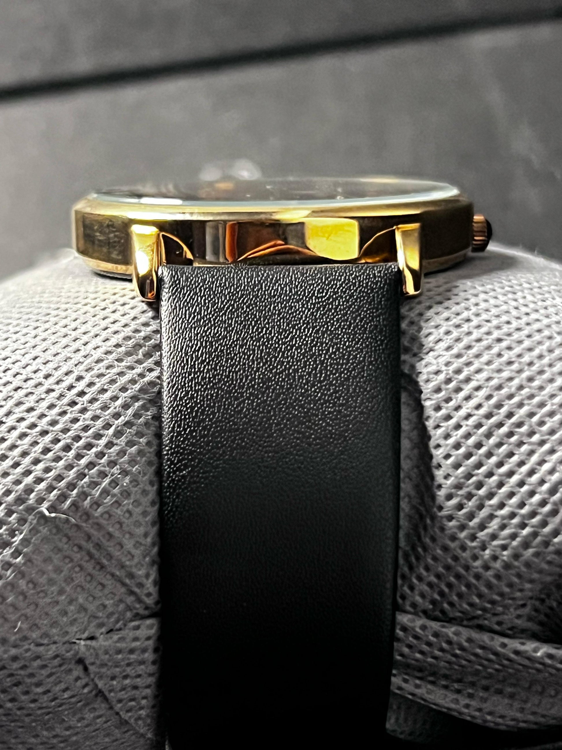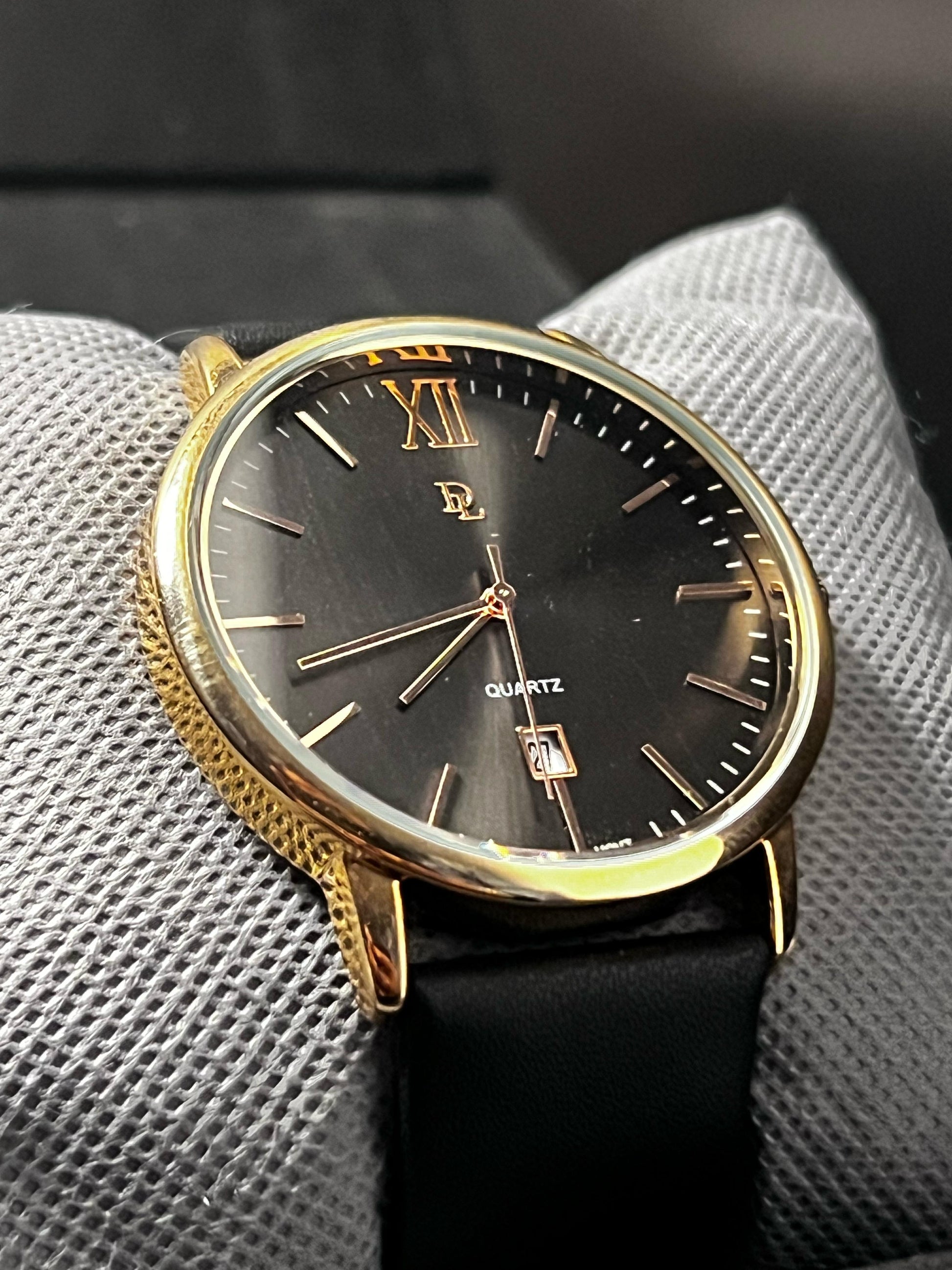 Refined elegance meets modern sophistication with the De Lawrence Midnight Gold Classic. Featuring a sleek black sunburst dial, gold-tone case, and a luxurious black leather strap, this timepiece is the perfect blend of style and precision. Comes with a 7-day exchange warranty for your peace of mind!