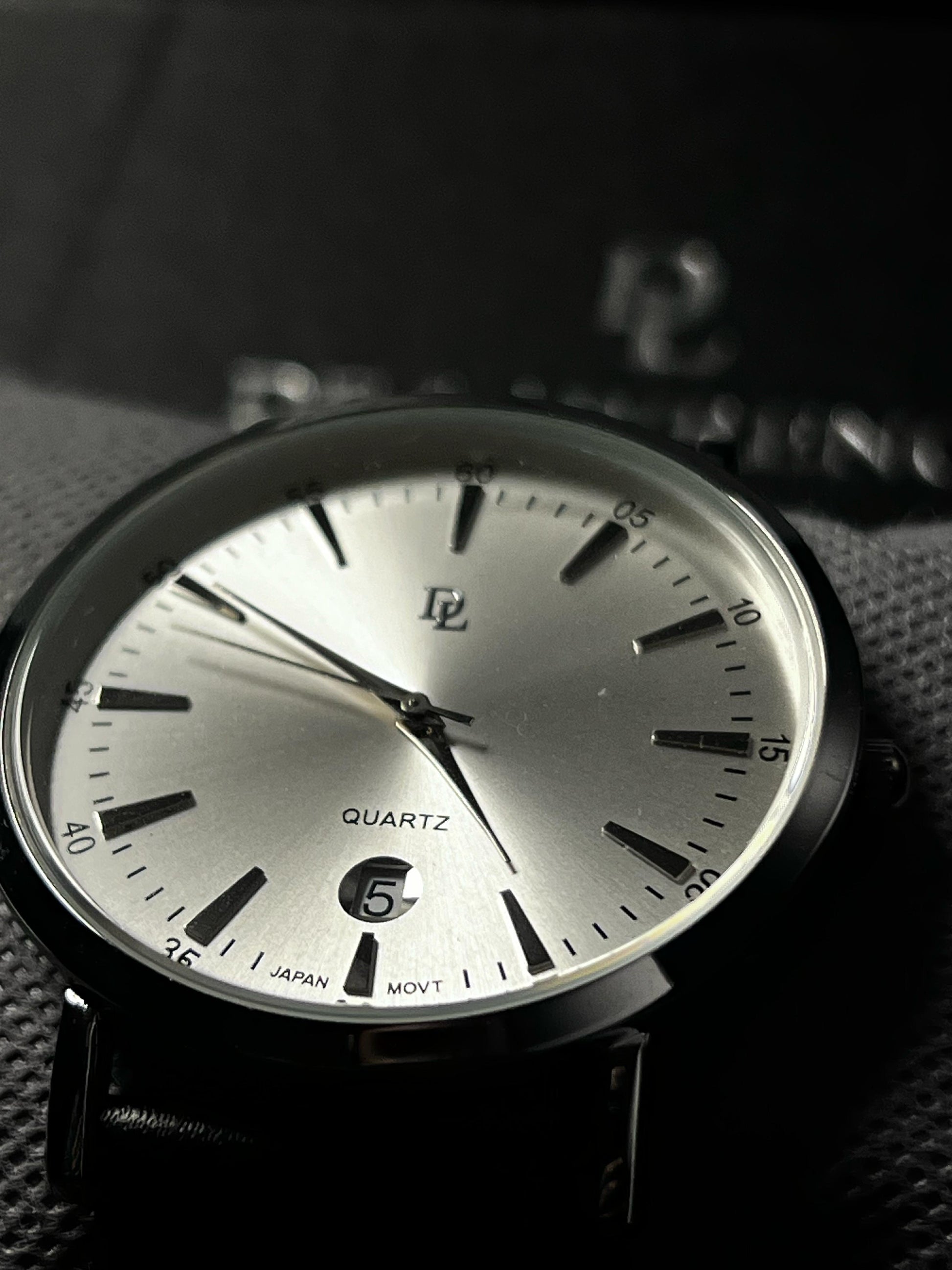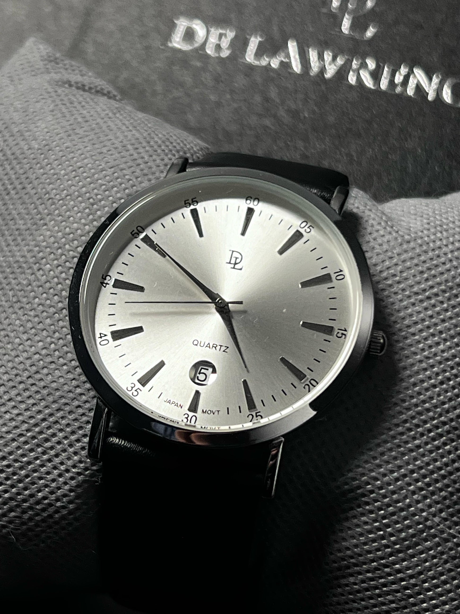 Elevate your style with the De Lawrence Silver & Black timepiece. Featuring a sleek silver dial with black detailing, a polished black case, and a premium black leather strap, this watch exudes elegance and sophistication. A date display adds practicality to its refined design. Includes a 7-day exchange warranty!