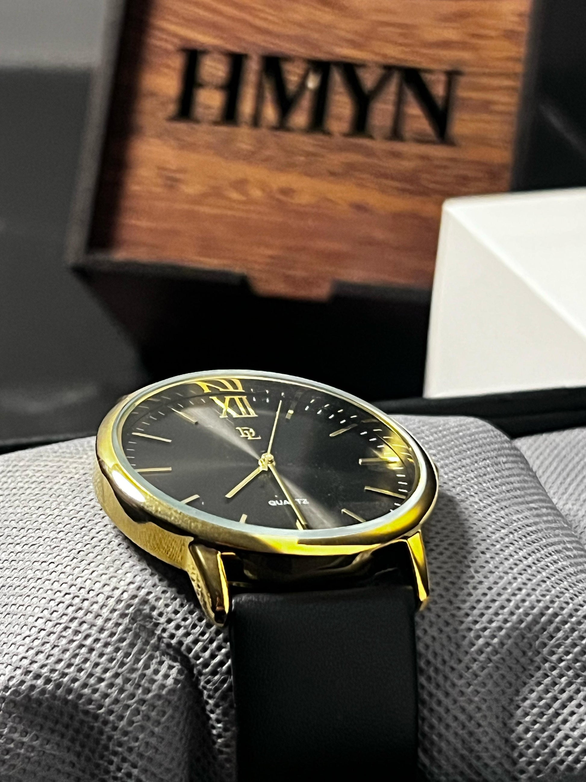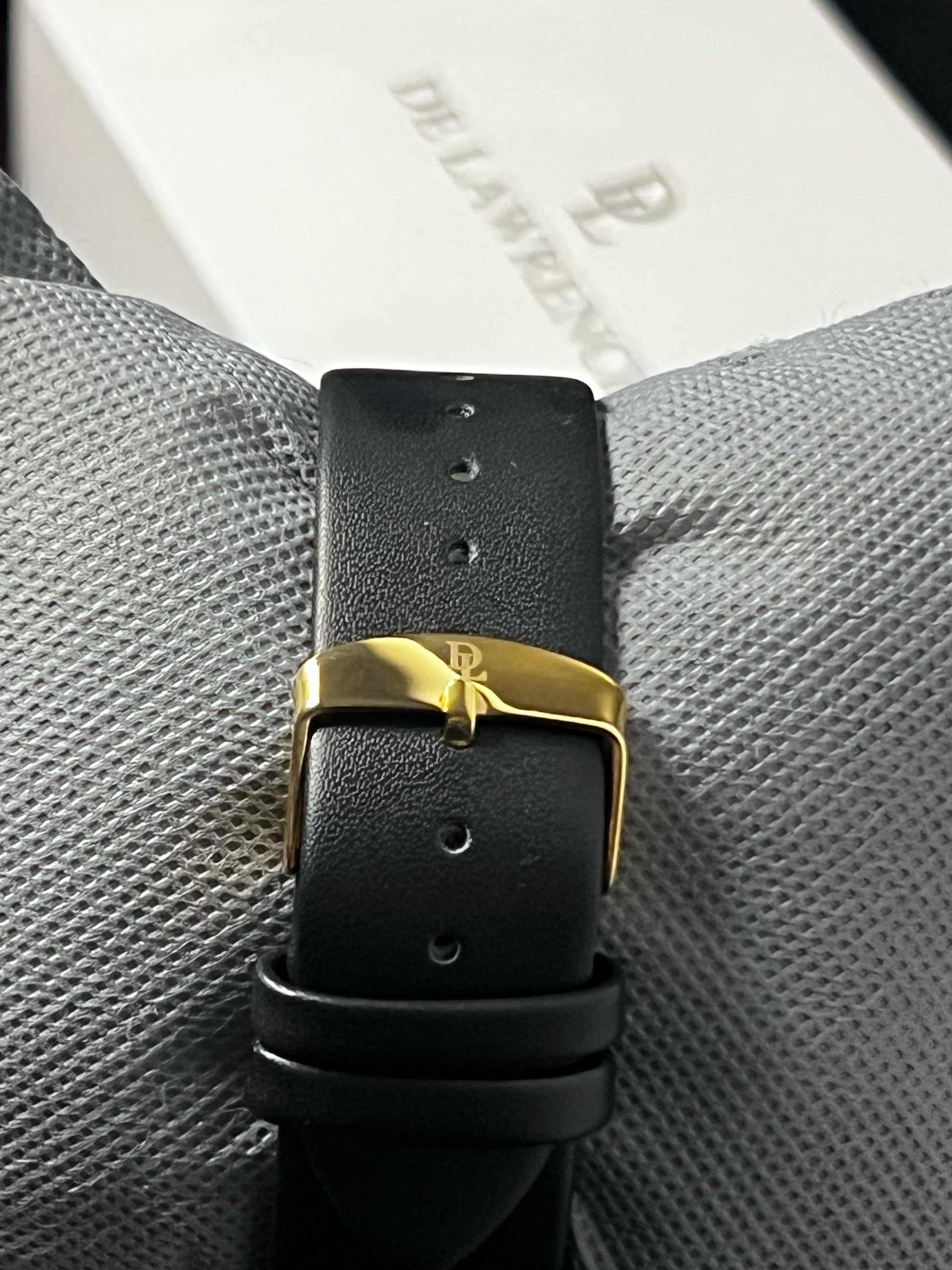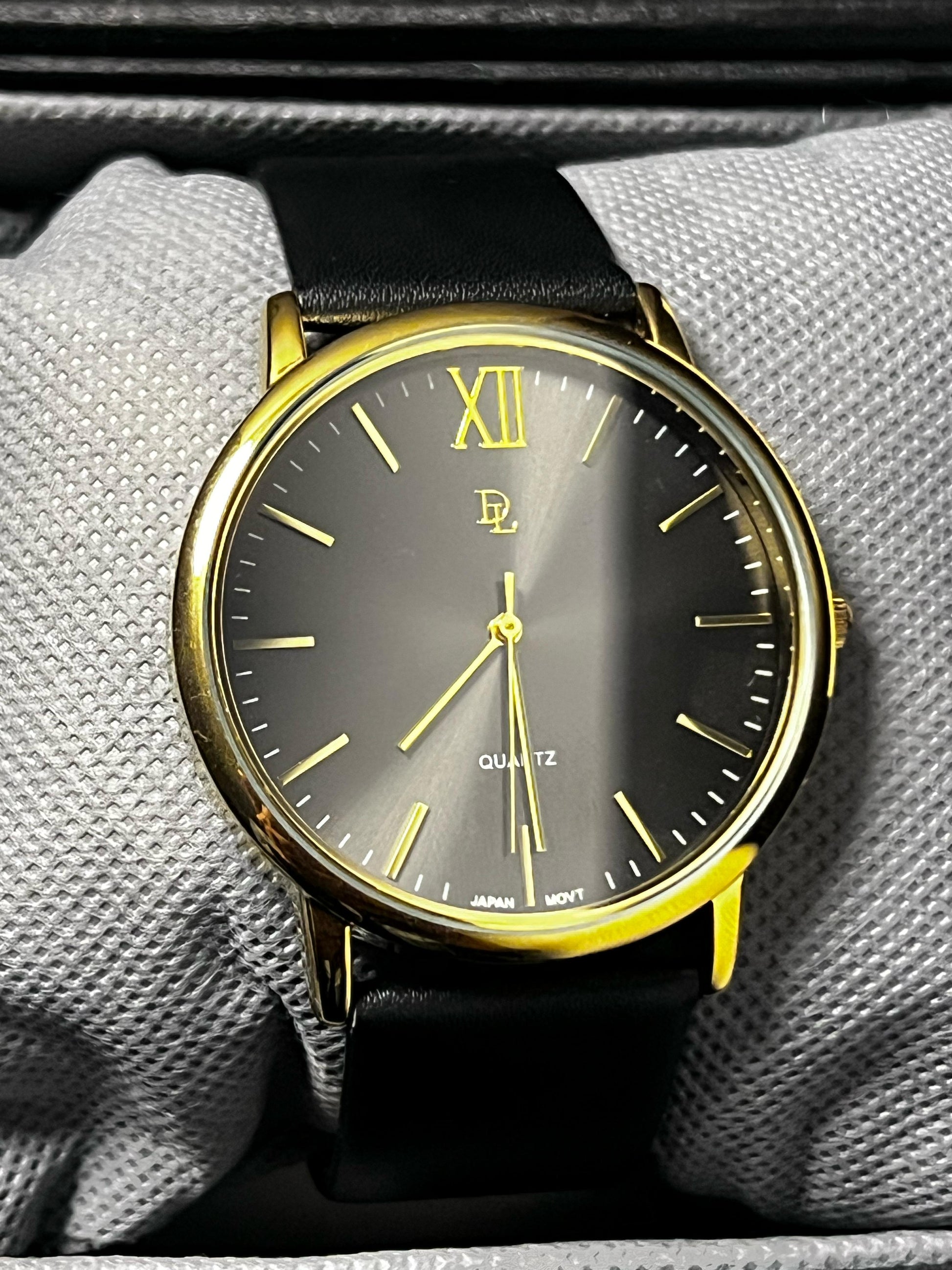 Make a bold statement with this De Lawrence timepiece, featuring a striking black dial, gold accents, and a sleek black leather strap. Its timeless design exudes elegance and sophistication, perfect for any occasion. Plus, enjoy a 7-day exchange warranty for a worry-free purchase!