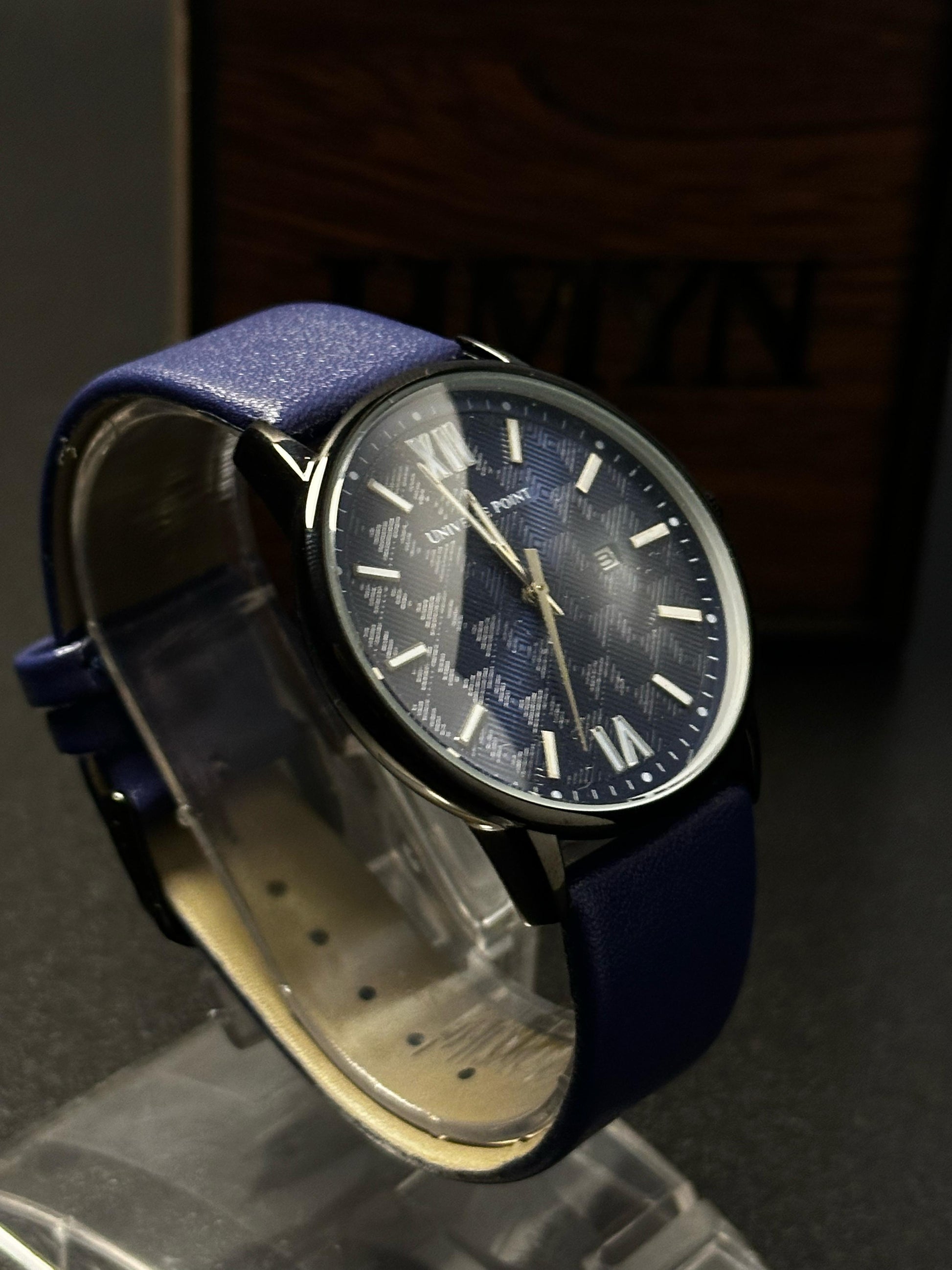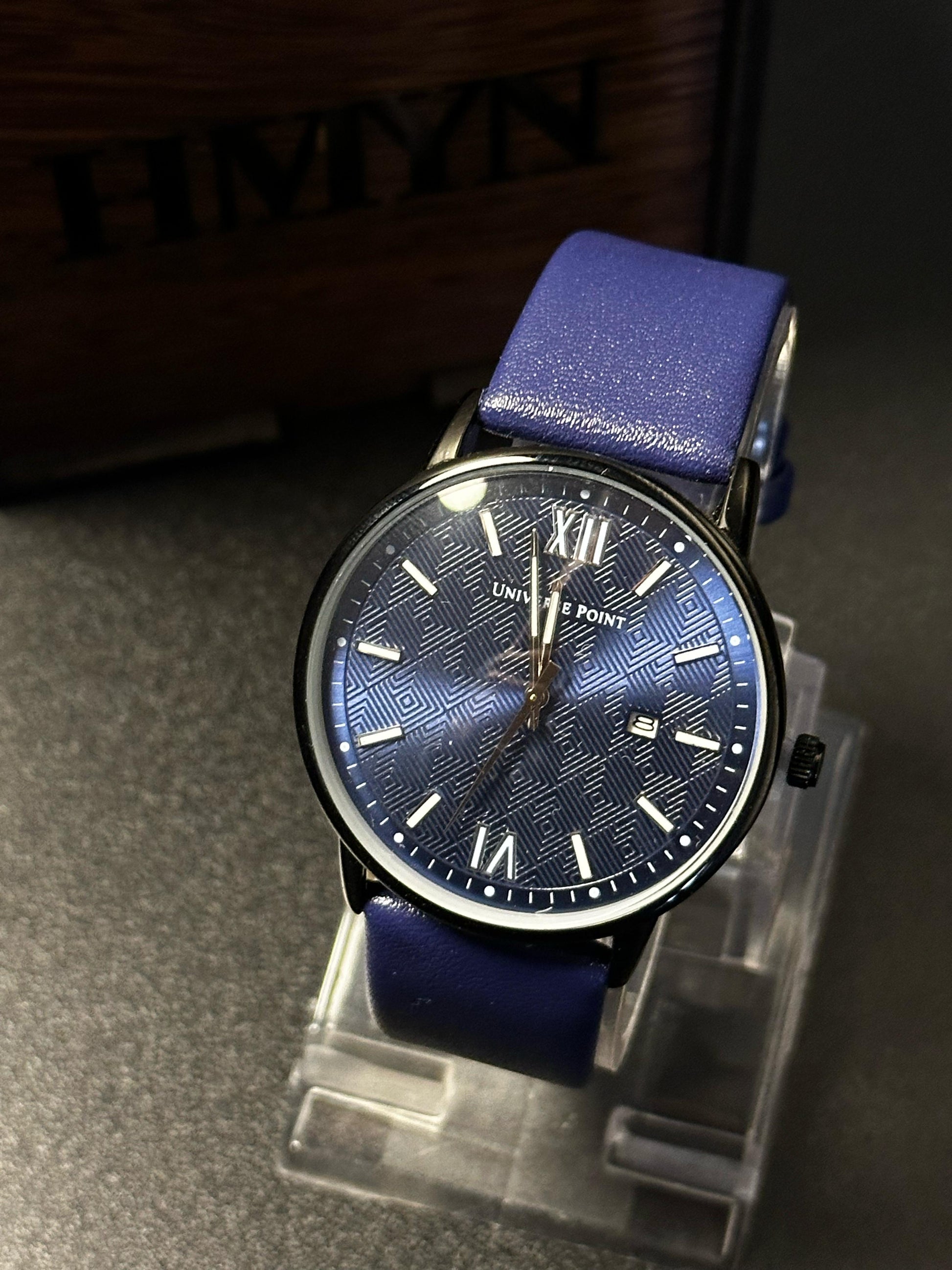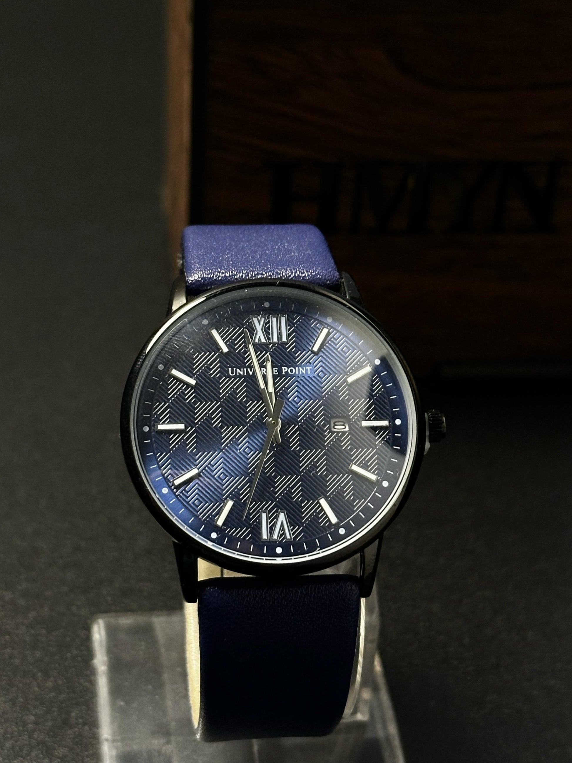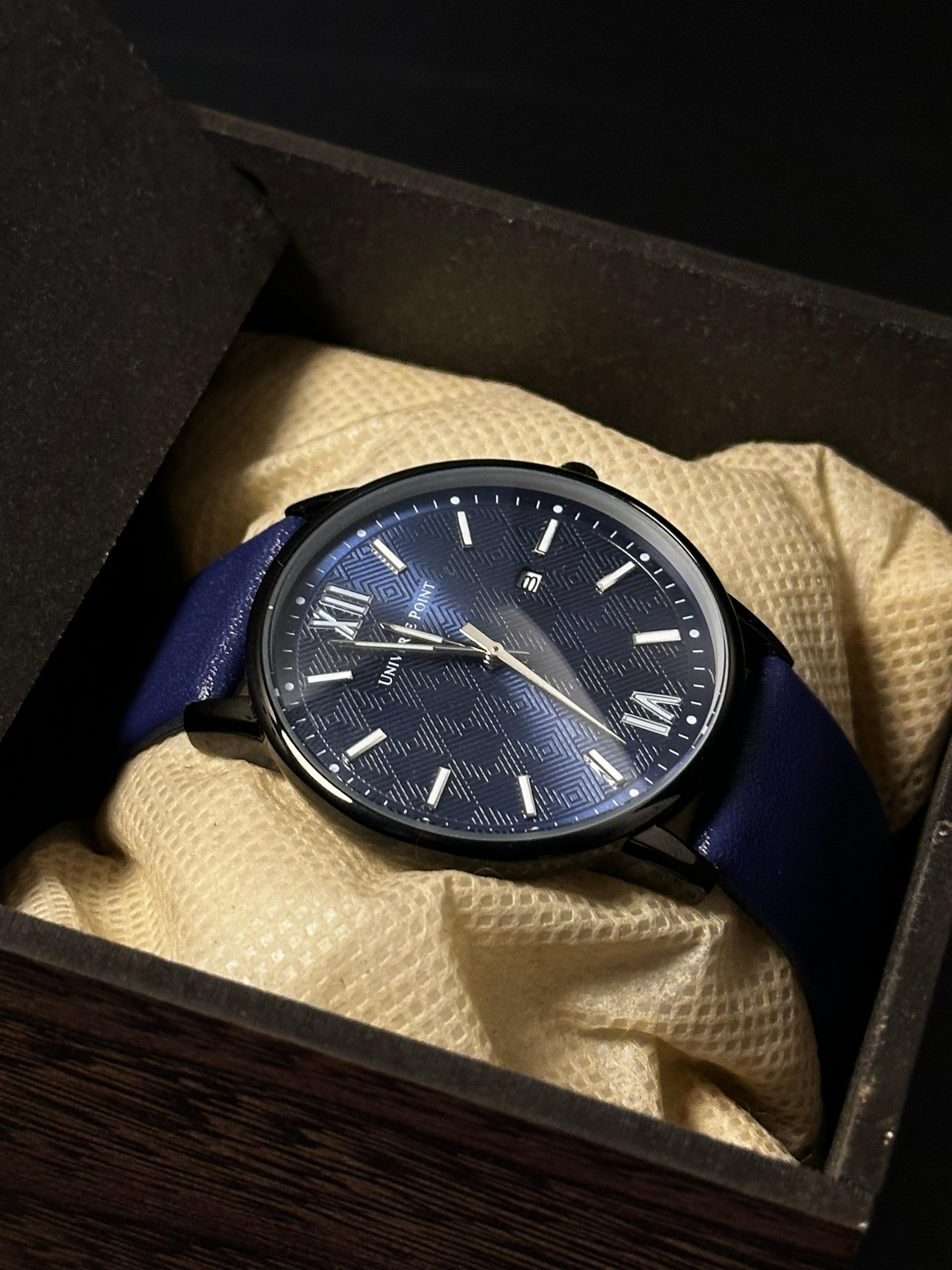 Effortlessly elegant with a splash of personality. This refined timepiece pairs a geometric-patterned blue dial with sleek Roman numeral markers, giving you a perfect blend of tradition and trend. The deep blue leather strap adds a pop of color while keeping it classy and wearable for any occasion.