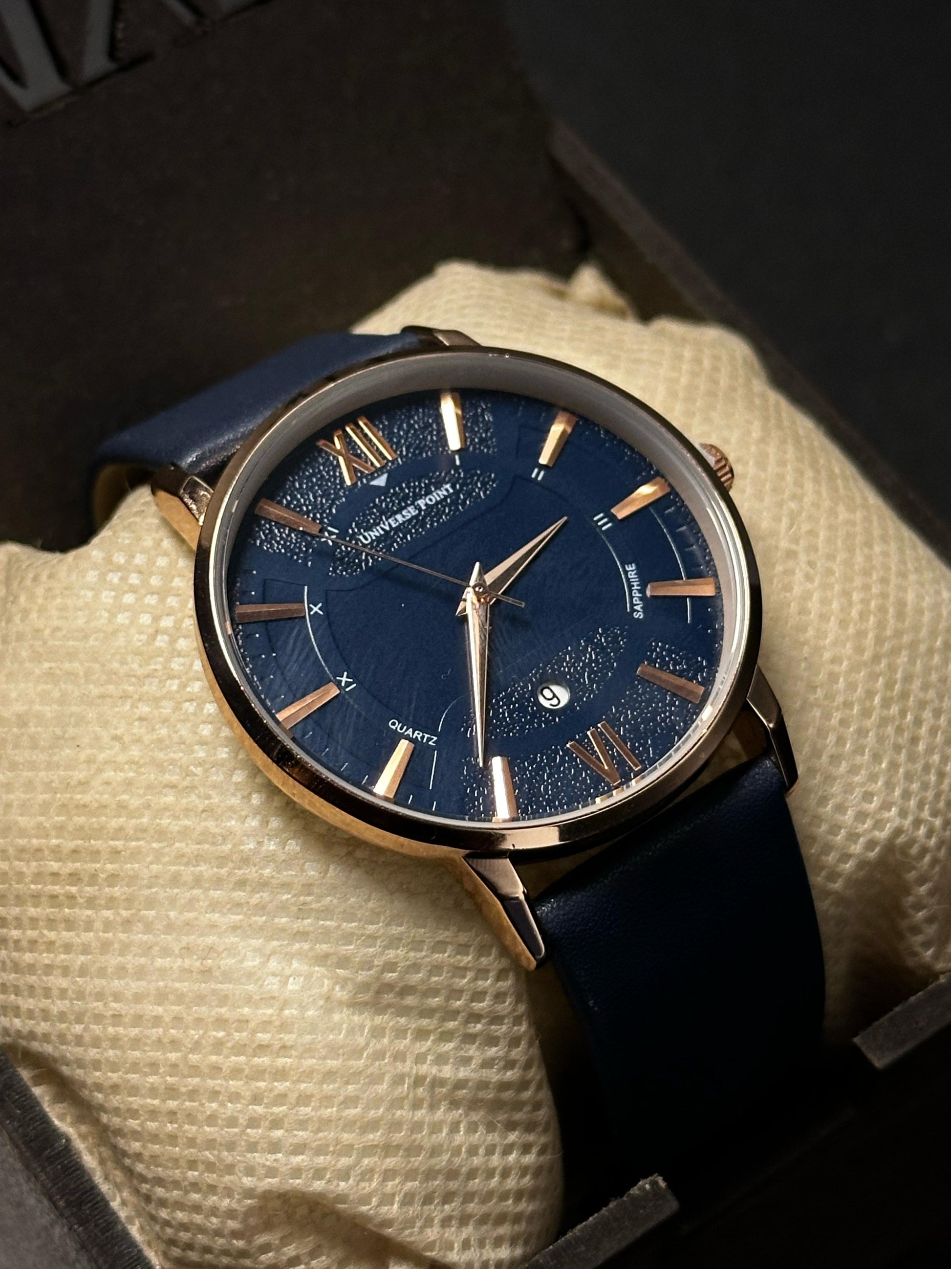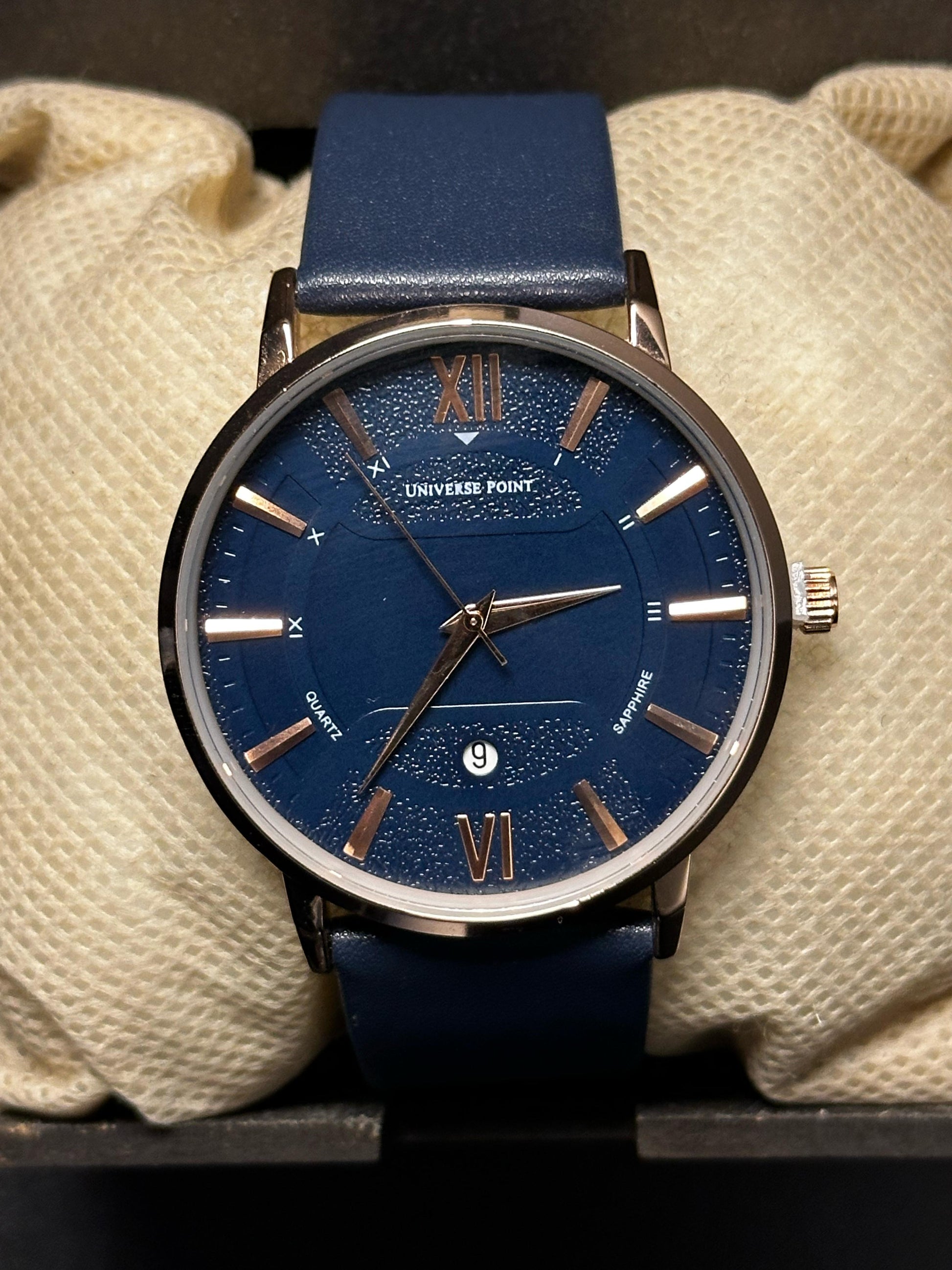 🔵 Deep navy blue textured dial for a subtle cosmic vibe