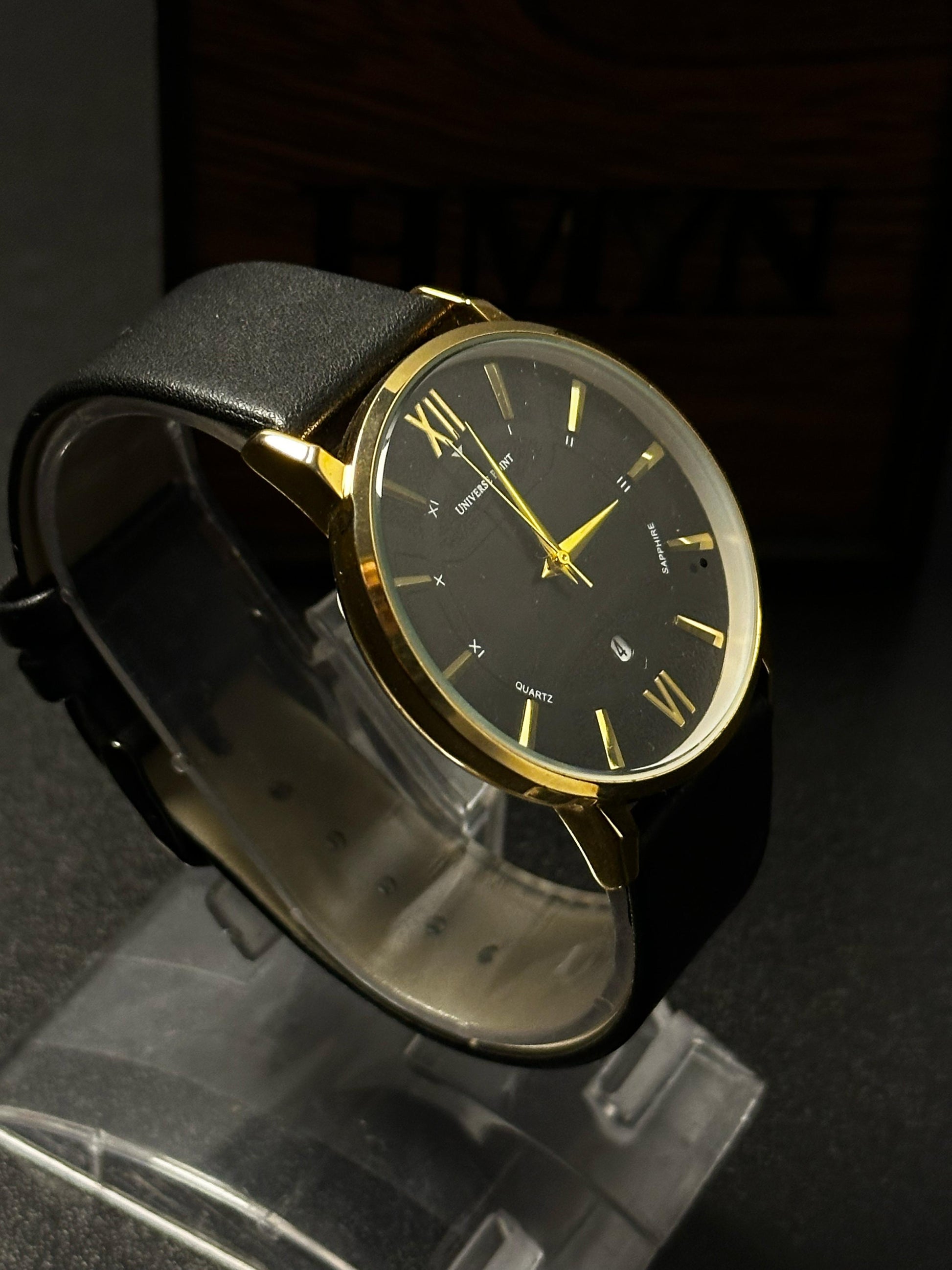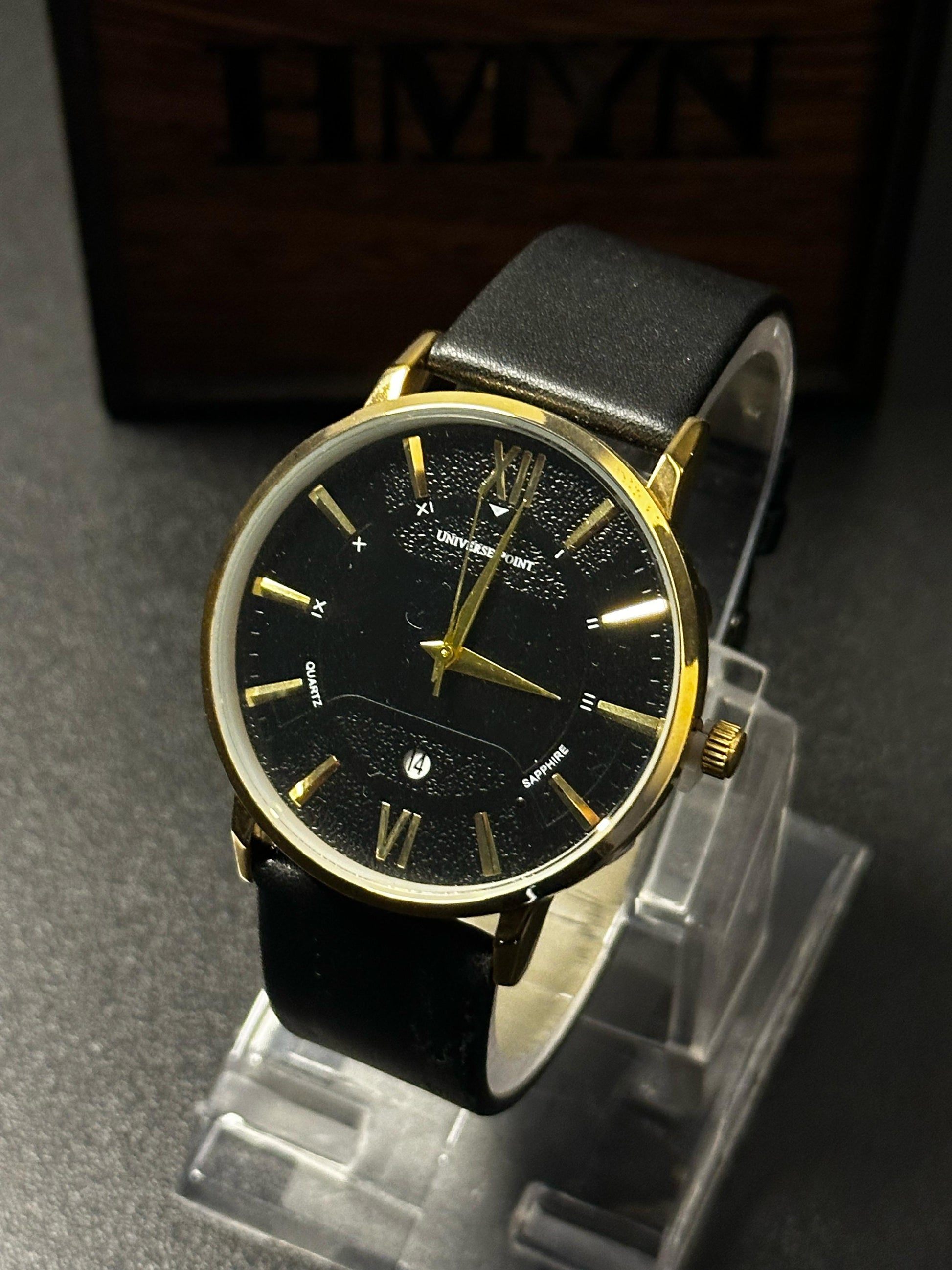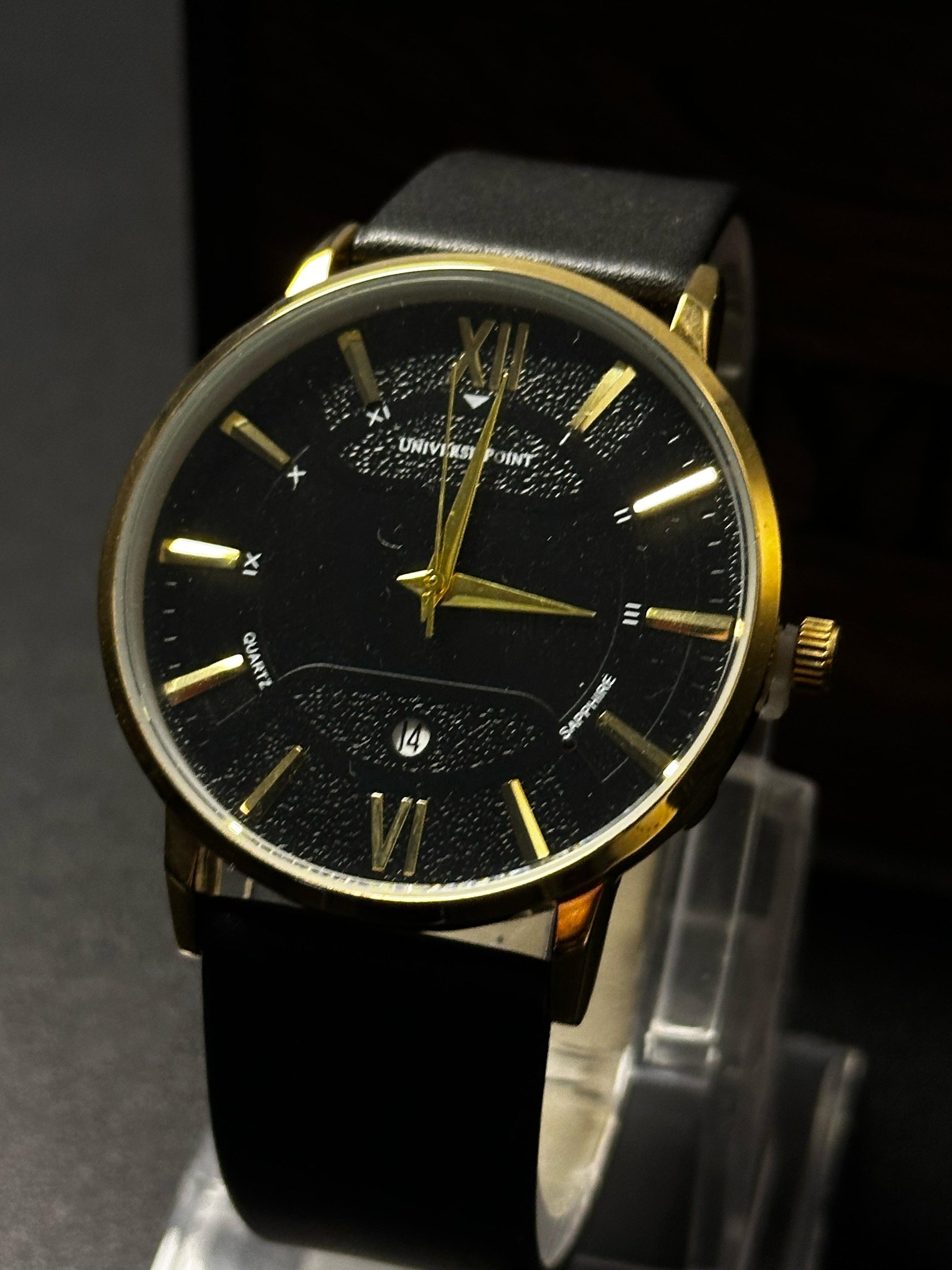 Command attention with every tick. The Midnight Gold from Universe Point is a refined classic, featuring a deep black dial with golden accents, Roman numerals, and a subtle date window. The matte black leather strap adds to its understated charm—perfect for everyday power moves or evening elegance.