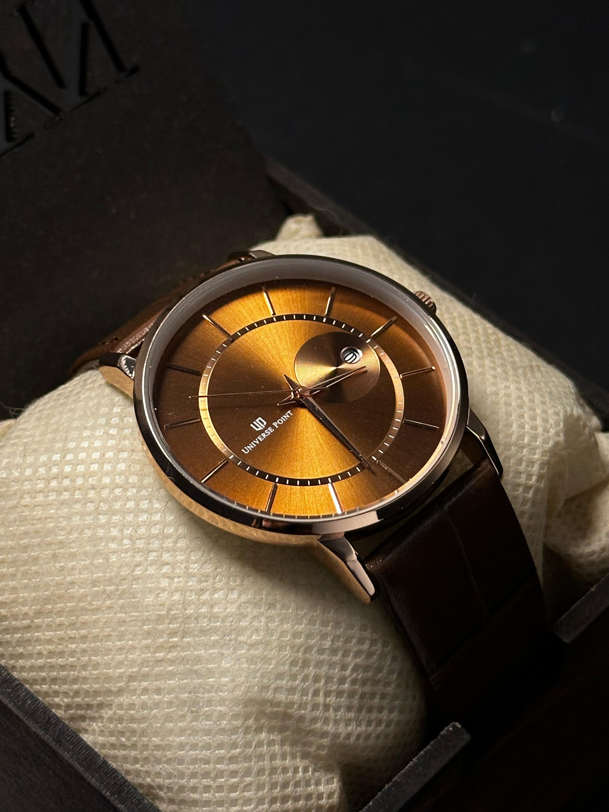 🧡 Rich sunburst amber dial – catching every angle with a golden glow
