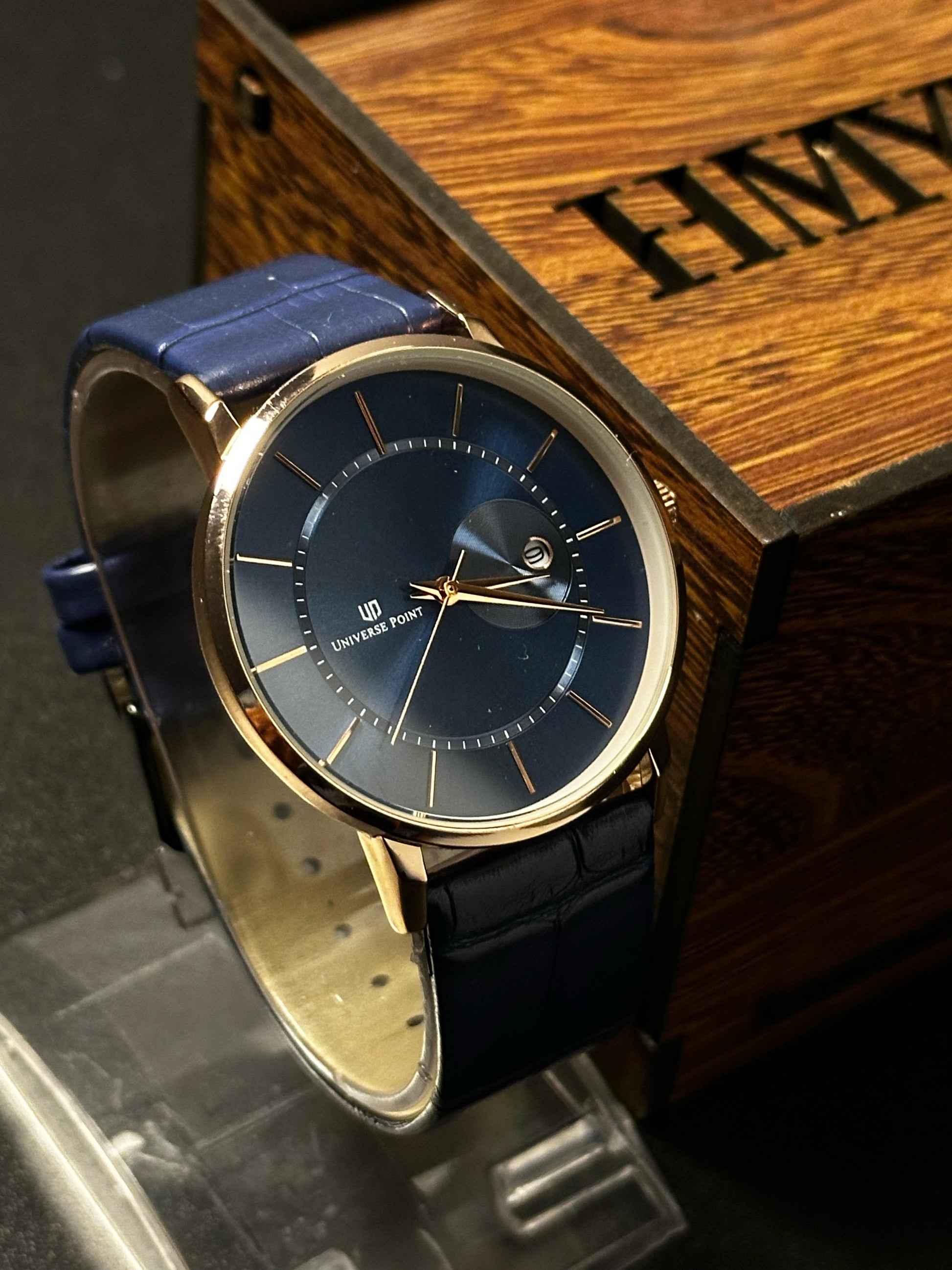 💙 Deep navy sunburst dial – radiates elegance with every flick of the wrist