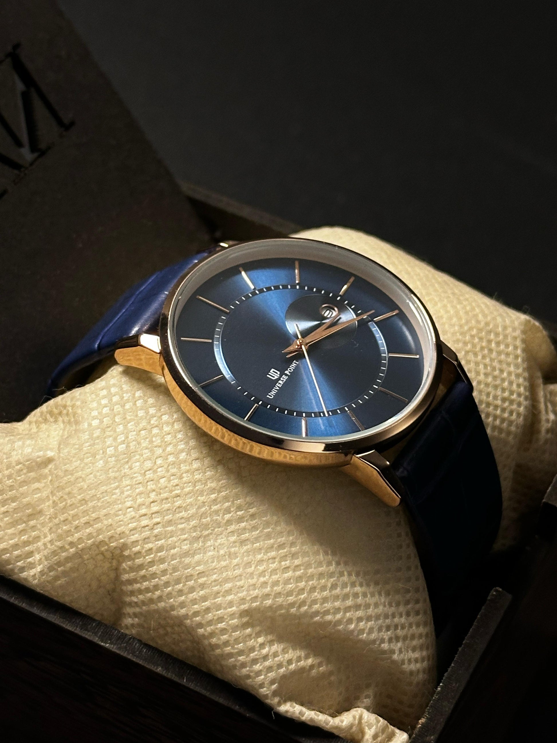 🔵 Textured royal blue leather strap – rich in tone and comfort