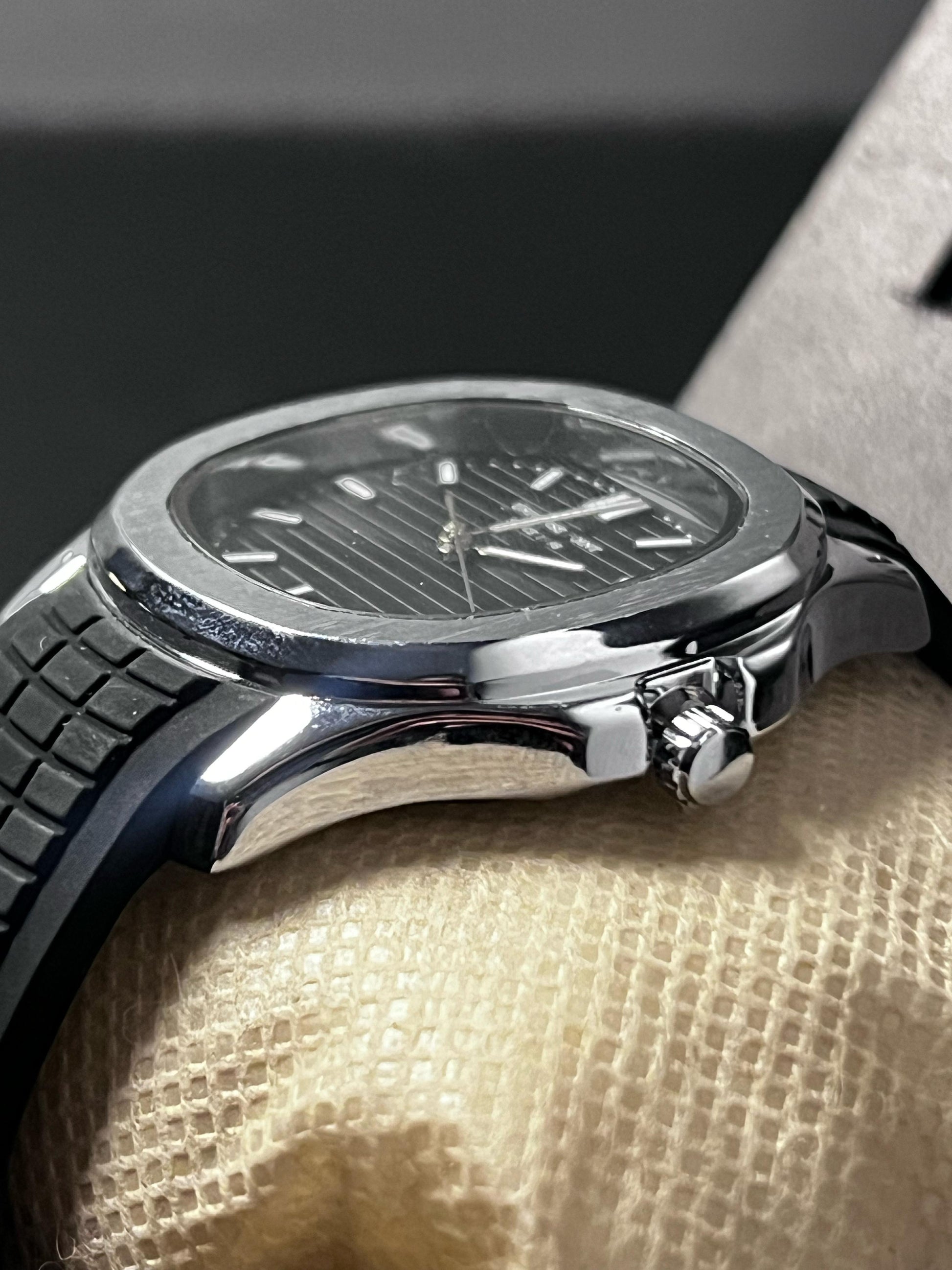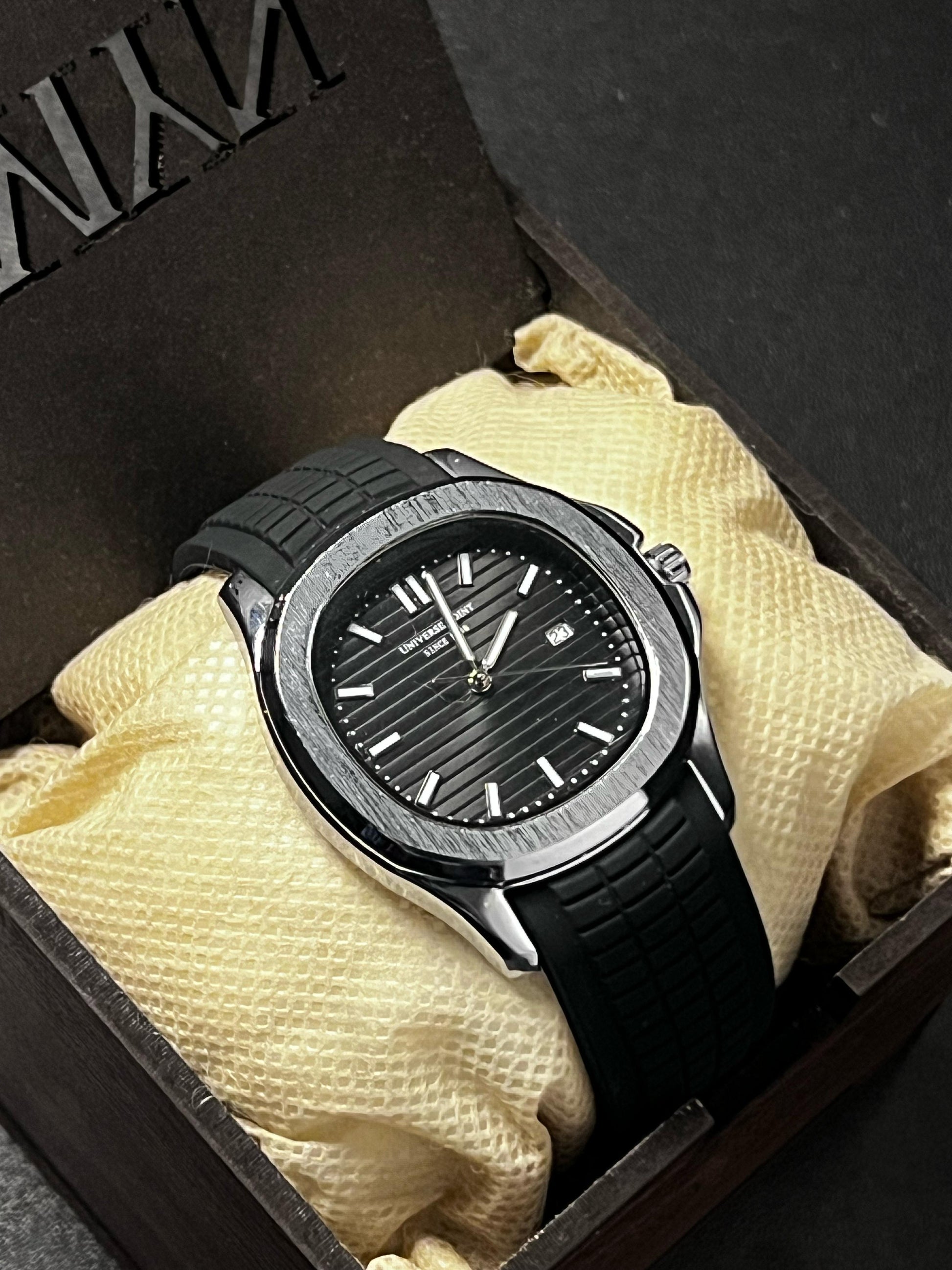 🖤 Matte Black Dial with Horizontal Ridge Texture – inspired by motion and modern architecture