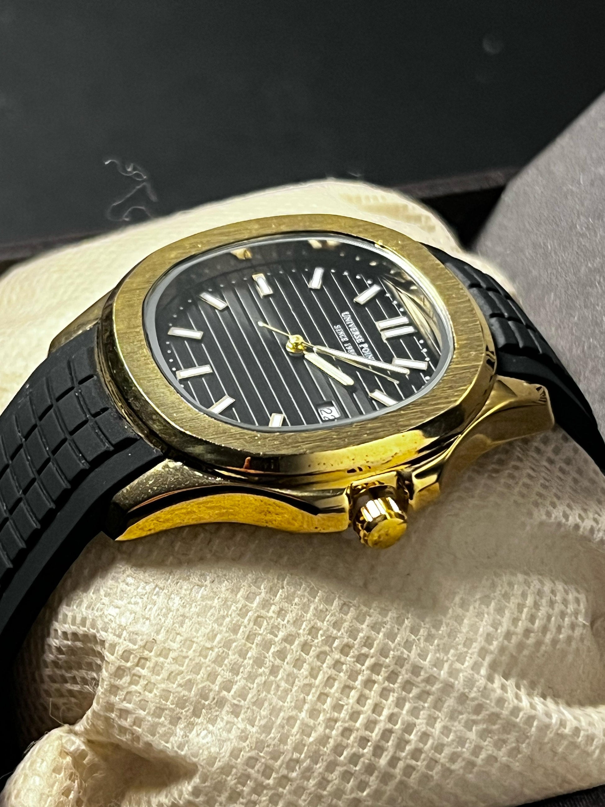 🖤 Matte Black Dial with Vertical Ridge Texture – echoes strength in symmetry
