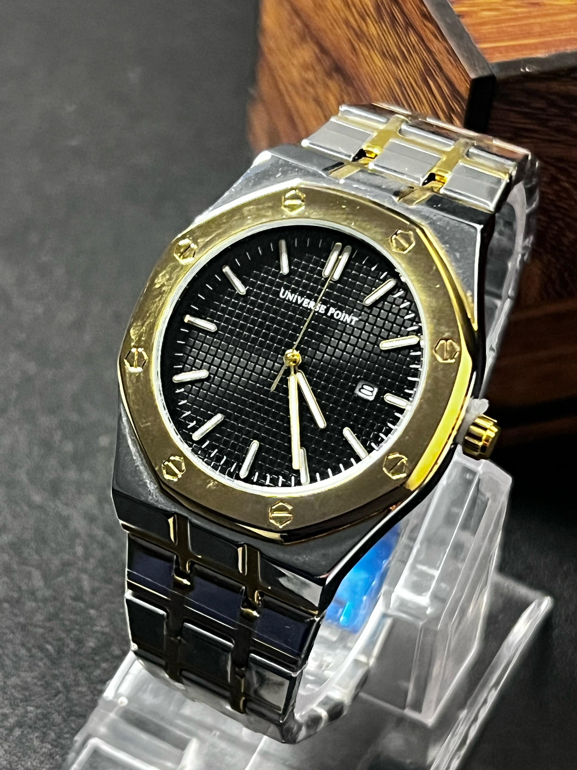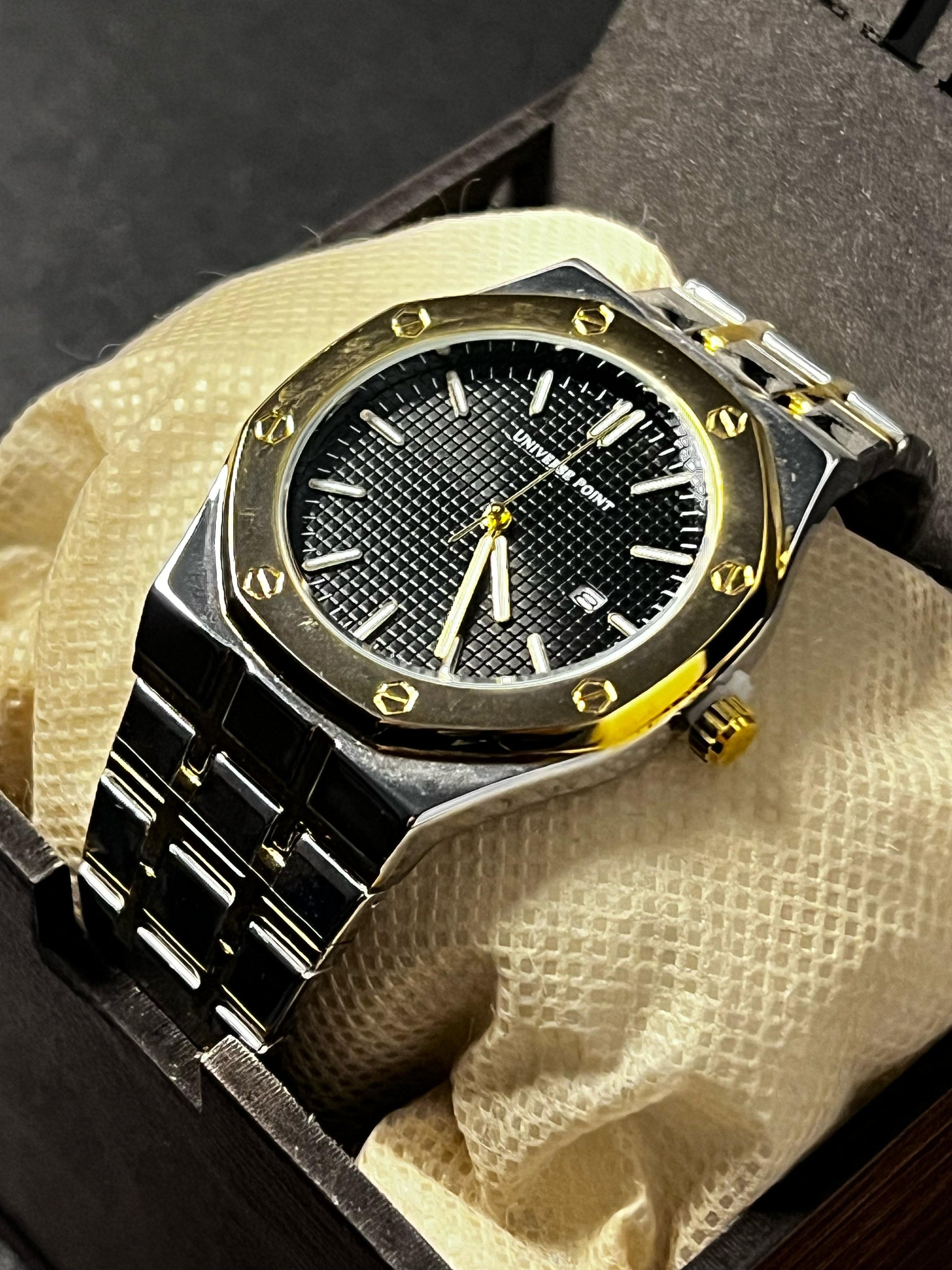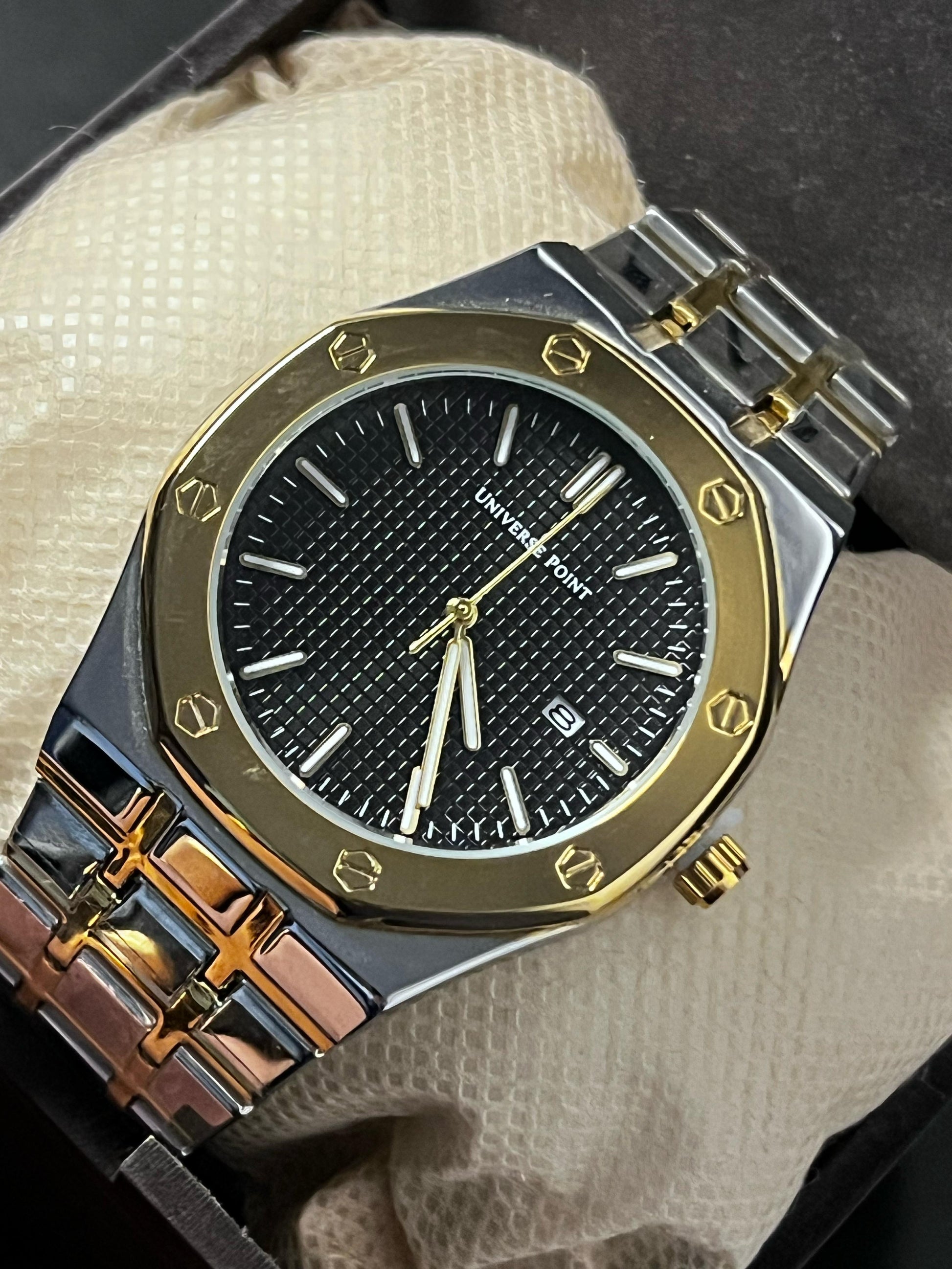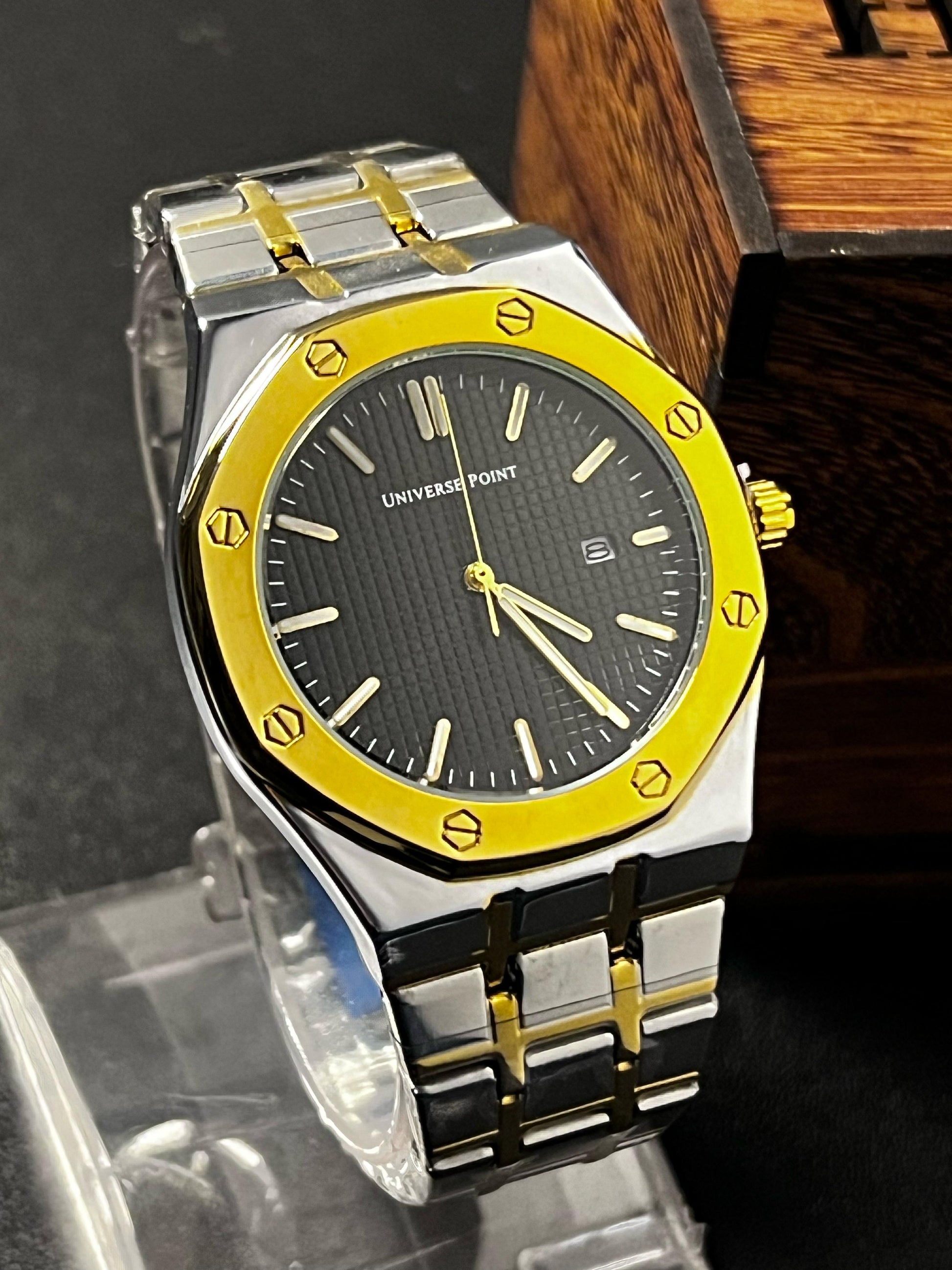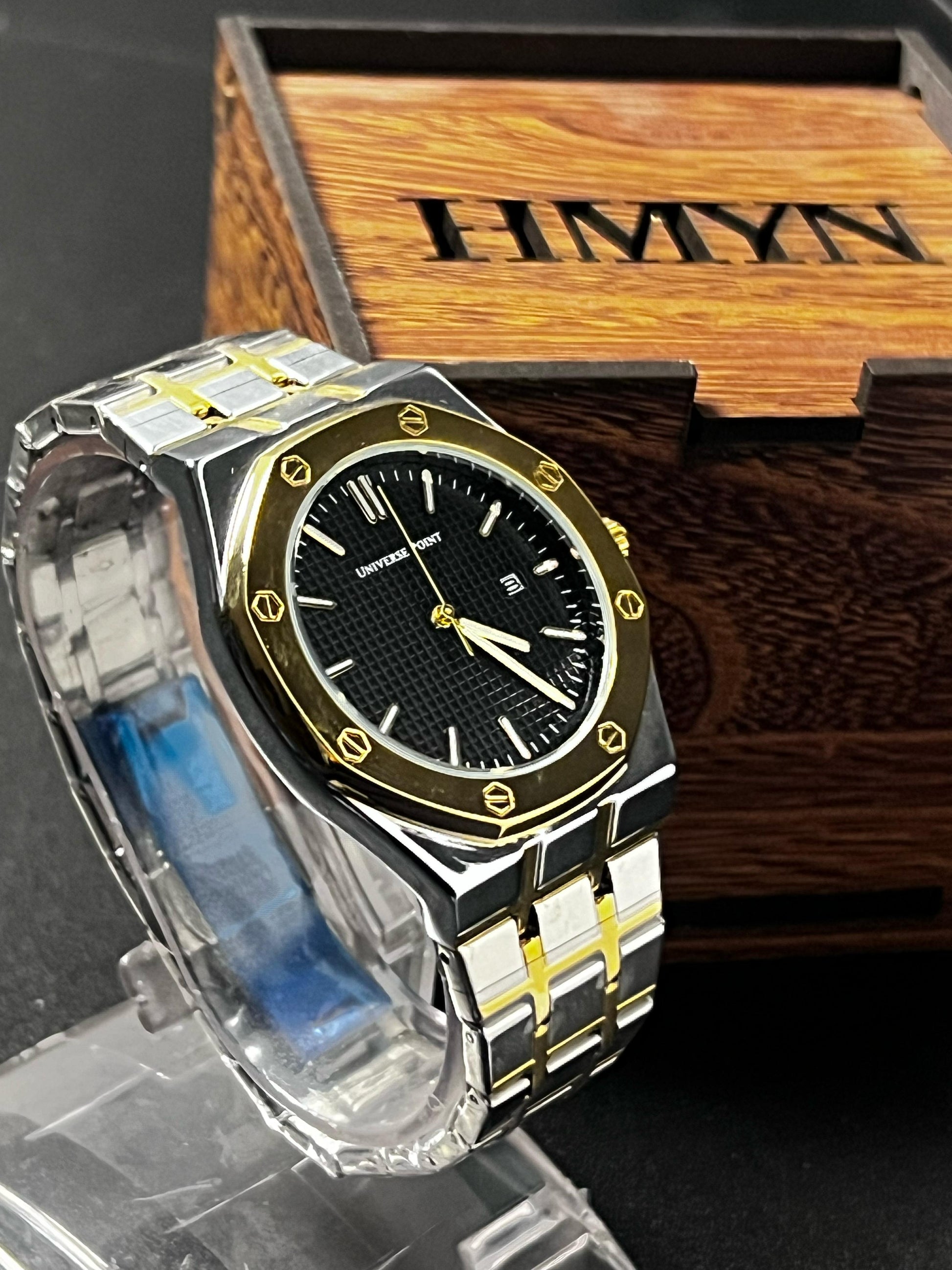 👑 Octagonal Bezel with Golden Screws – unmistakably royal with industrial flair