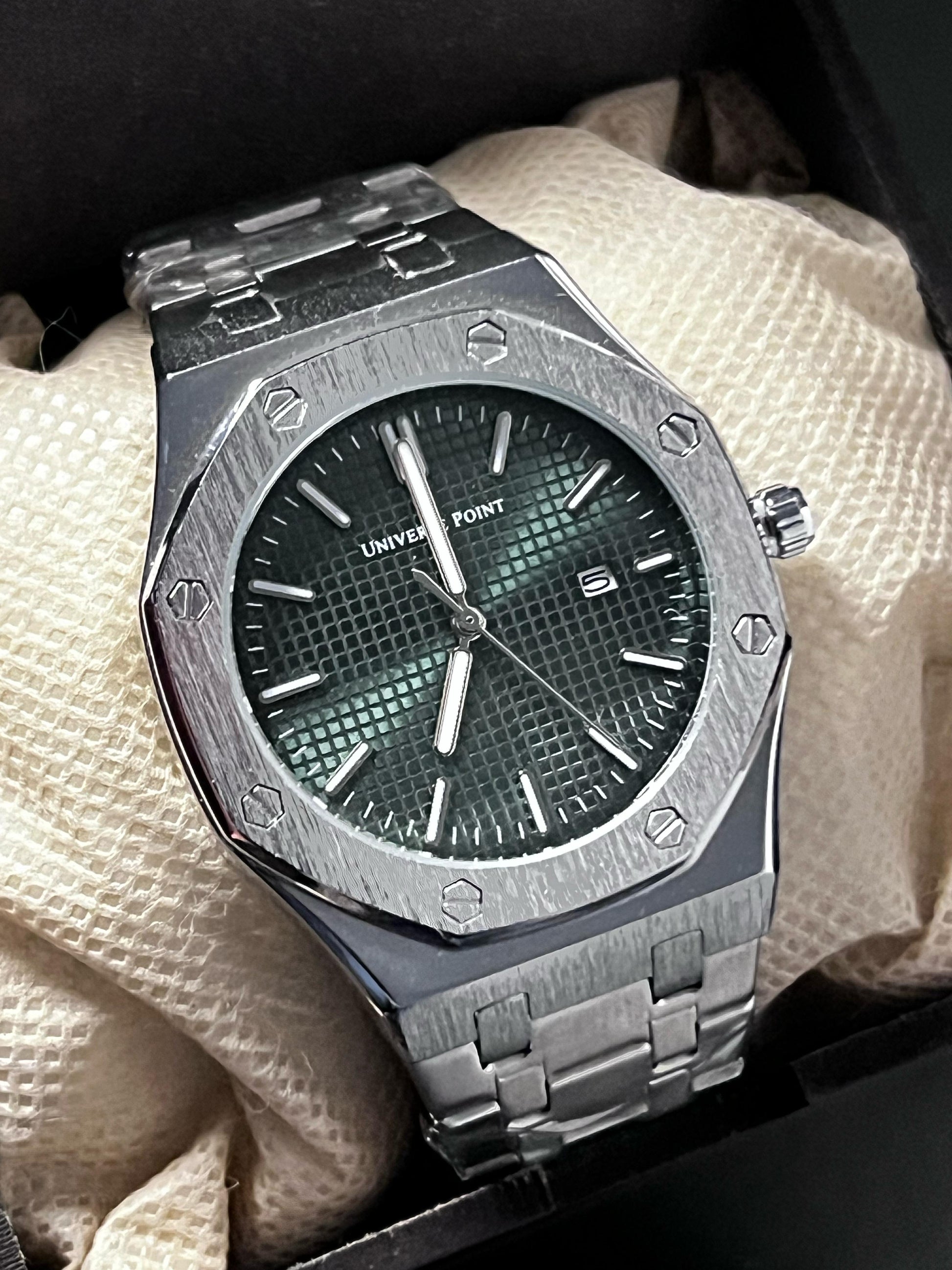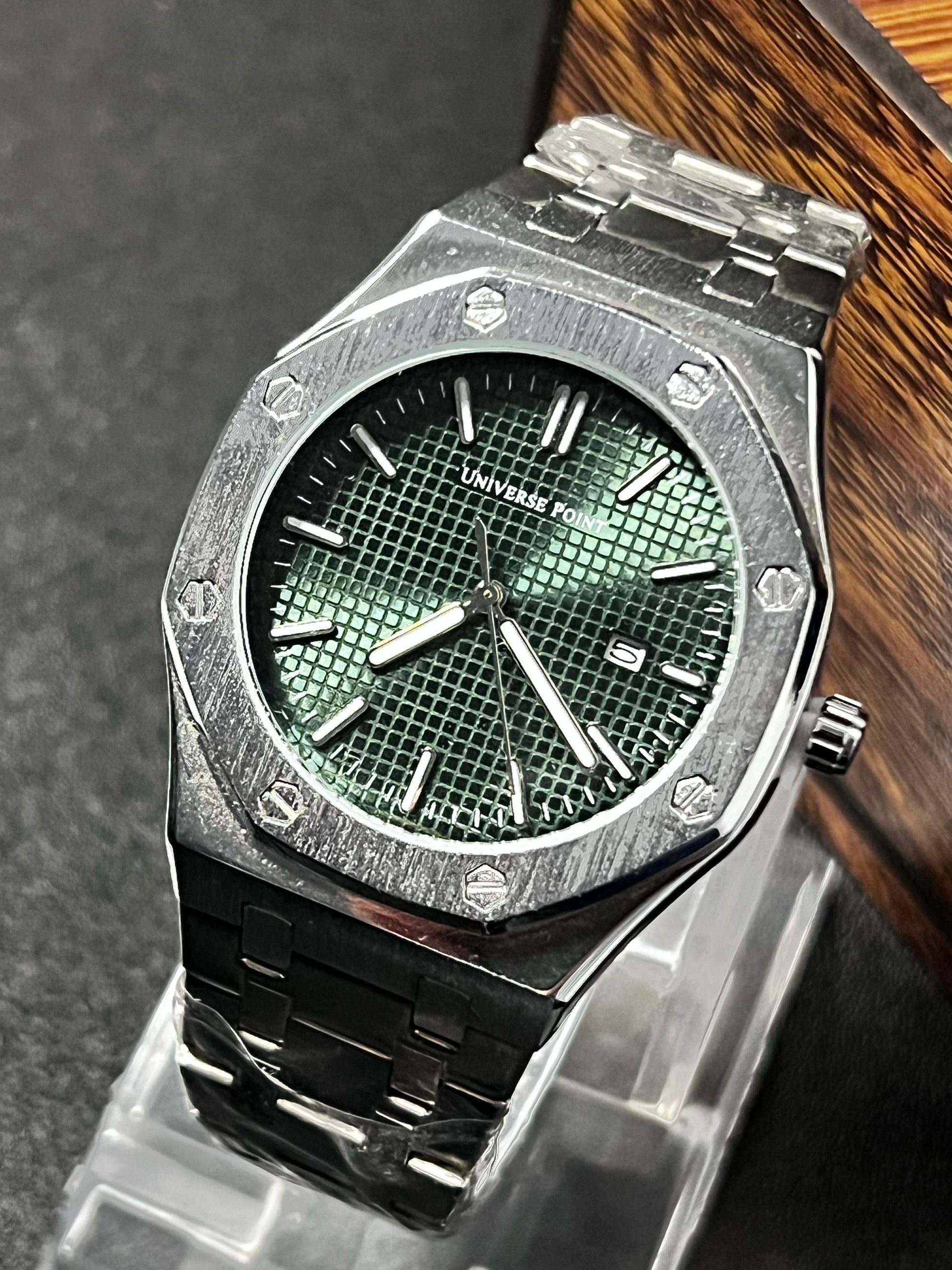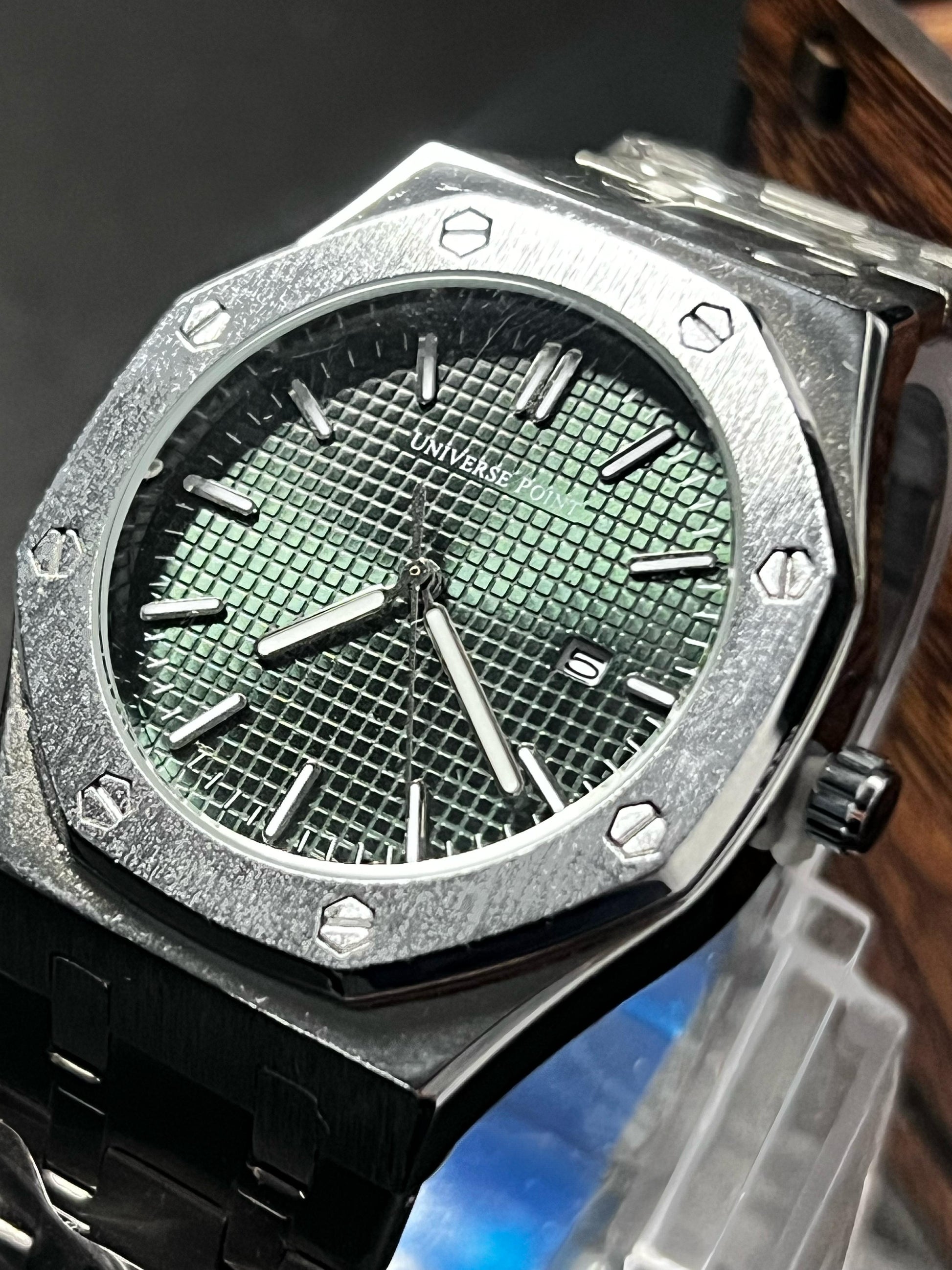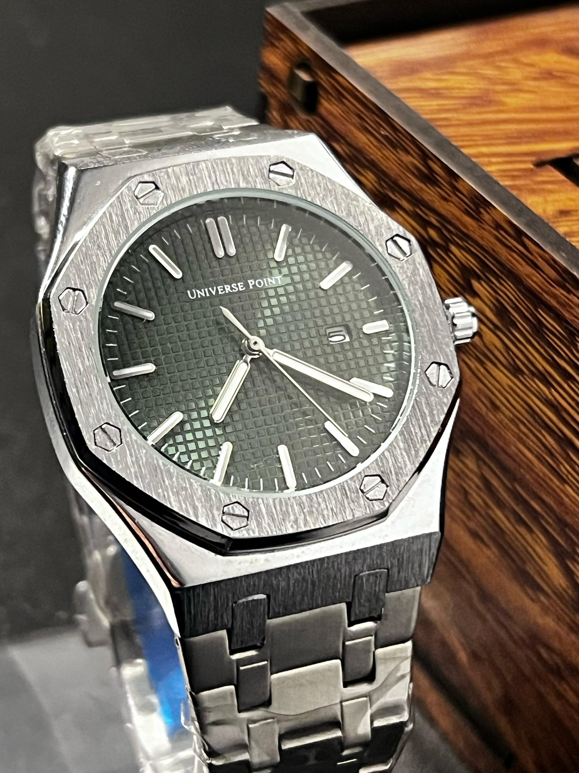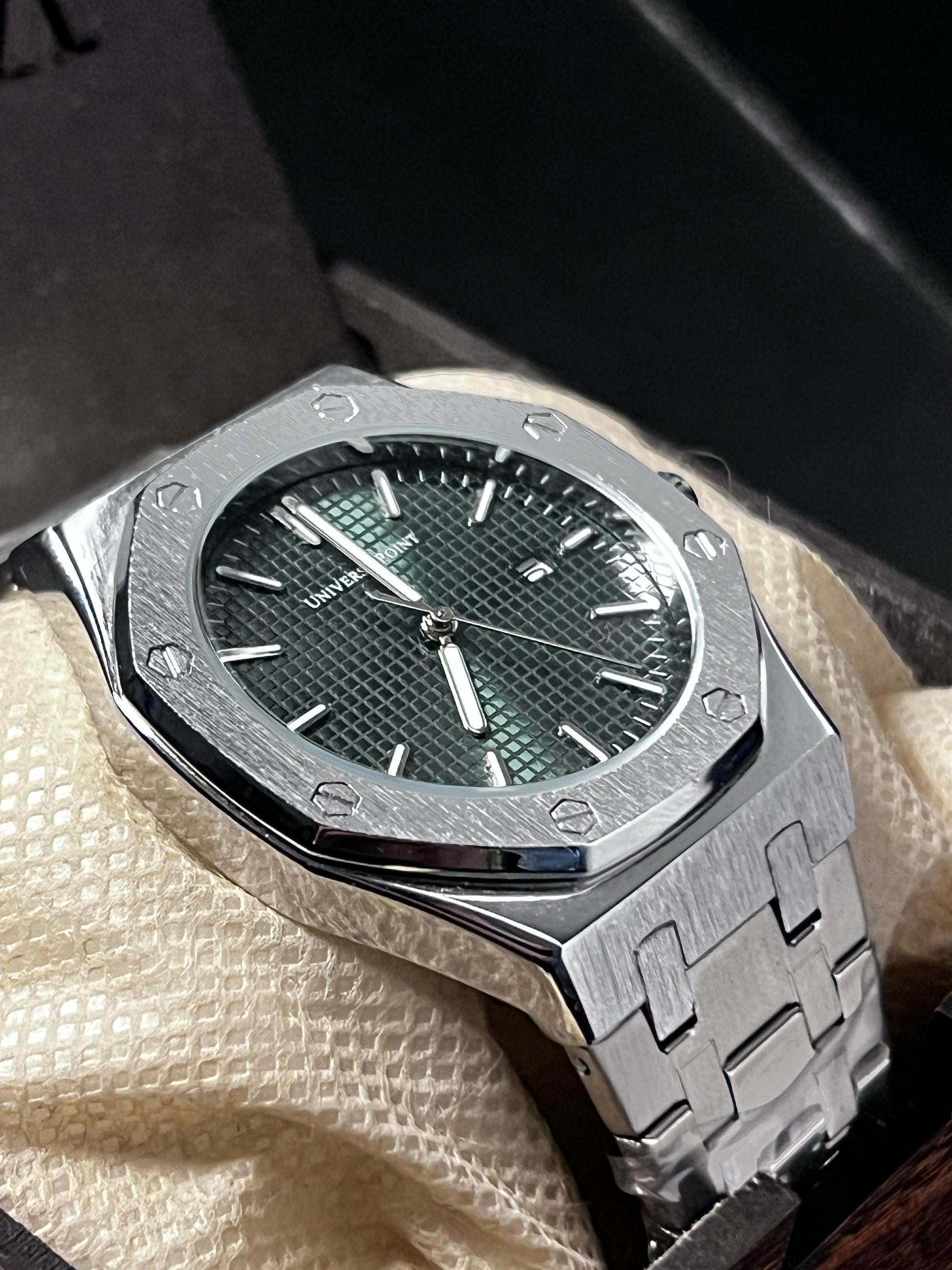 🖤 Dark Emerald Dial – subtle green that shifts under light, with a waffle-textured surface