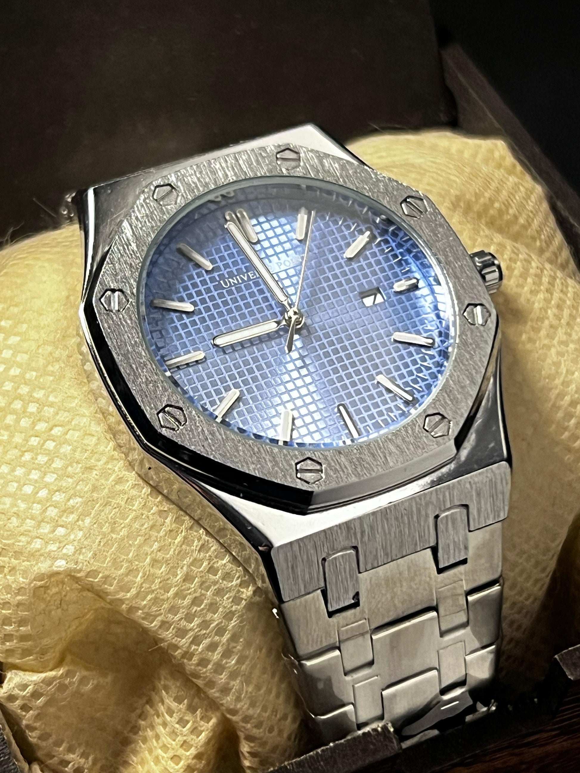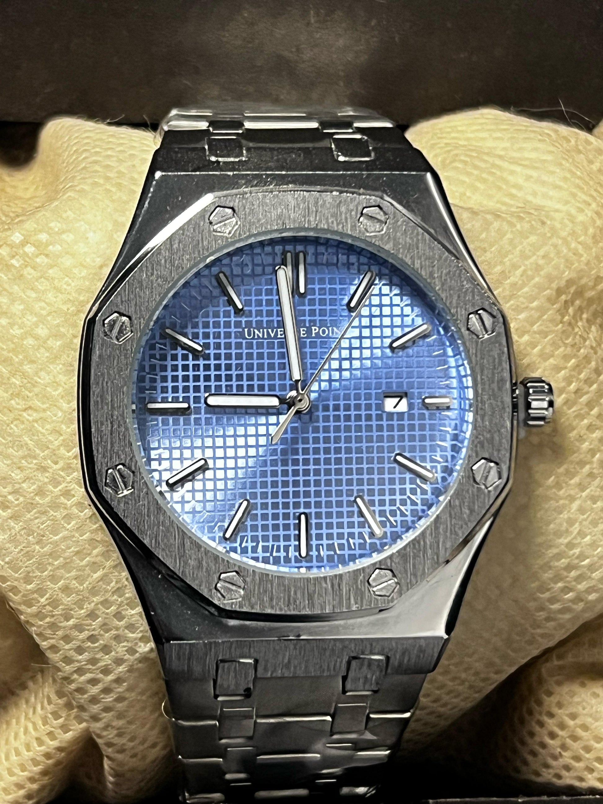 Add a splash of sophistication to your wrist with this bold timepiece from Universe Point. The eye-catching metallic blue textured dial is perfectly complemented by a brushed silver stainless steel case and strap. Whether it's a business meeting or a night out, this watch adds instant elegance to your look.