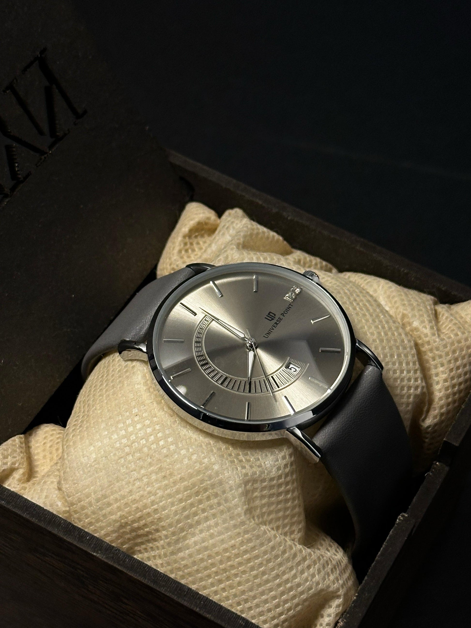 ✨ Textured silver sunray dial with geometric date arc